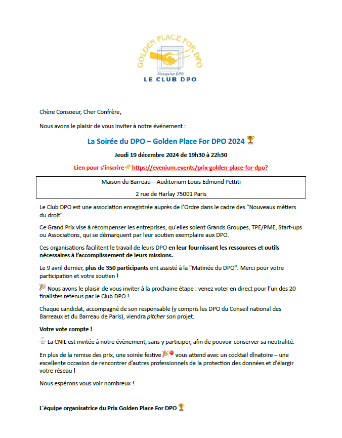 Soirée du club DPO - jeudi 19 décembre à 19h30 à la maison du barreau